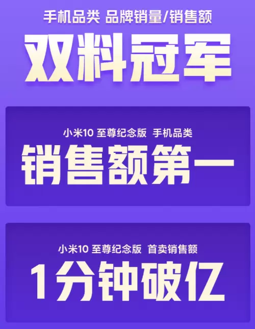 在雷军火爆人气的加持和两款至尊纪念版新机的带动下,首次“出征”超级品牌日的小米10至尊纪念版“一战成名”,发售后成交额势如破竹,1分钟即突破1亿,当天在手机品类中成交额稳居第一。