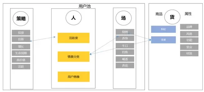 用户池与场景库,实现的是用户认知与知识图谱的高度结合,搭建的是用户、场景、知识、商品、内容的大规模语义网络结构,服务于电商从数百亿商品中选择数百款优势商品的能力提升。