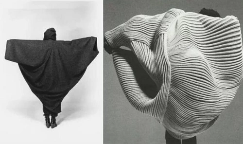 通过这种手工折叠的方式,让每一件衣服有了不规则的空间,穿着它的人,身体像被空气包裹,多变而轻盈。三宅一生说:正是身体与衣服之间的空间创造了服饰。