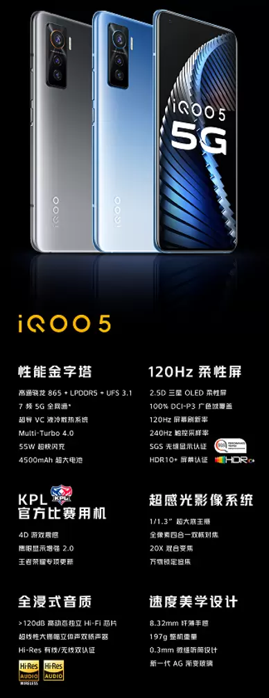 iQOO 5系列包括iQOO 5、iQOO 5 Pro两款产品,采用了骁龙865移动平台+LPDDR5内存+UFS 3.1闪存组合,支持7频5G网络,配备一块2.5D三星OLED柔性屏,刷新率为120Hz,触控采样率为240Hz,可以带来灵敏又跟手的触控体验。iQOO 5 Pro支持120W超快闪充,15分钟可将手机电量充入100%,并通过了德莱茵TUV安全快充认证; 此外,iQOO 5配备了一块4500mAh大电池,支持55W超快闪充,机身厚度为8.32mm,整机重量为197g,采用新一代AG渐变玻璃设计,有星溯、皓影两种配色可选。