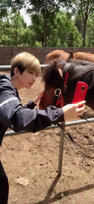 而其实更早之前,就有疑似从友人处流出的马场照,照片中熊祁掏出了手机,“捕捉”到一匹小黑马和它大玩自拍——没错,依旧是那部亮眼的红色手机。