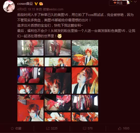 而之前曲豆也曾入手美图V6,他表示对美图V6种草已久,自黑说“不管现实多狗血”,用美图手机拍下的COS照片是“最理想的”,更直言“追求出片质感”的人一定会喜欢。