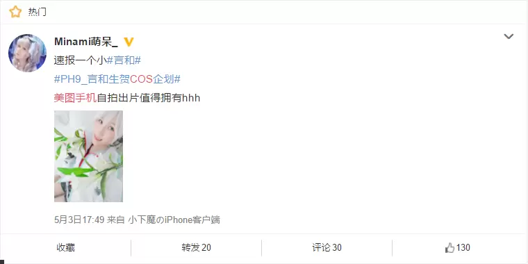 不得不说,如今越来越多的coser开始尝试用美图手机出片,效果确实不错。比如coser Minami萌呆_的这张用美图手机的自拍,更是萌倒一众吃瓜群众,连她自己也说“美图手机自拍出片值得拥有hhh”