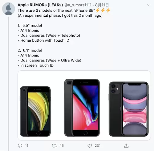 此前就有消息称,除了目前4.7英寸的2020款iPhone SE外,苹果还正在准备5.5英寸的iPhone SE,外观与尺寸与iPhone 8 Plus完全一致。
