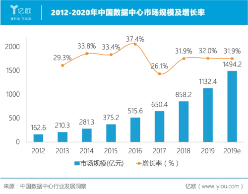 数据中心即一个组织或单位用以集中放置计算机系统和诸如通信和存储这样的相关设备的基础设施,具有集中式部署、算力高的特点,能够提供极超大规模的计算能力。据研究表明,2019中国数据市场规模总体营收已达1132.4亿元,将来仍将保持30%以上的年复合增长率。
