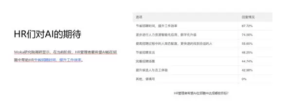 Moka研究院前段时间做了个关于AI的调研,发现将近90%的HR小伙伴,希望AI能够帮助节省招聘时间,提升工作效率;其次才是招聘数字化和人岗匹配。