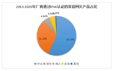 面对全球IPv6快速普及的形势及国内相关政策的推进,近年来三大基础电信运营商在设备集采工作中对IPv6支持性也提出了要求,众多厂商纷纷开展家庭网关类产品的IPv6升级工作以扩大市场份额。从全球IPv6测试中心了解到的数据显示,今年申请IPv6认证的家庭网关产品数量有了明显提升,仅第二季度通过测试并获得IPv6 Ready认证的家庭网关产品就有23款,除此之外,目前全球IPv6测试中心还有十余款在测的家庭网关产品。通过查阅IPv6 Forum官网,对比我国厂商家庭网关产品的IPv6升级情况,数据显示,截至2020年6月,中兴和华为旗下家庭网关产品的IPv6认证数量领先于行业:中兴旗下通过IPv6认证的产品数最多,占比56.79%;华为旗下家庭网关通过认证数占32.10%,位列第二;烽火和友华通过认证的产品数紧随其后。为保障产品IPv6升级的效率和质量,越来越多的设备厂商开始积极申请IPv6测试认证,以打造品牌价值和产品竞争力,进而在出口和国内运营商采购环节脱颖而出。