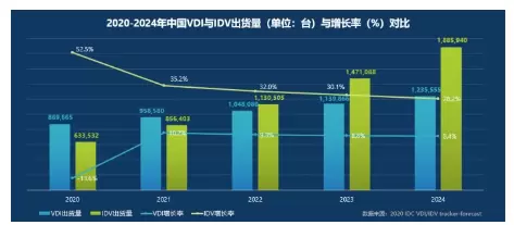 IDC:2020-2024中国VDI与IDV出货量与增长率对比
