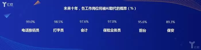 亿欧创始人黄渊普先生在开场致辞时提到:“无论是悲观还是乐观,业内的一个共识是:人工智能将取代很多工作岗位。”而据牛津大学的两名教授Carl Benedikt Frey和Michael A. Osborne的研究成果,未来最可能被AI取代的职业,电话推销员以99.0%的概率首当其冲。