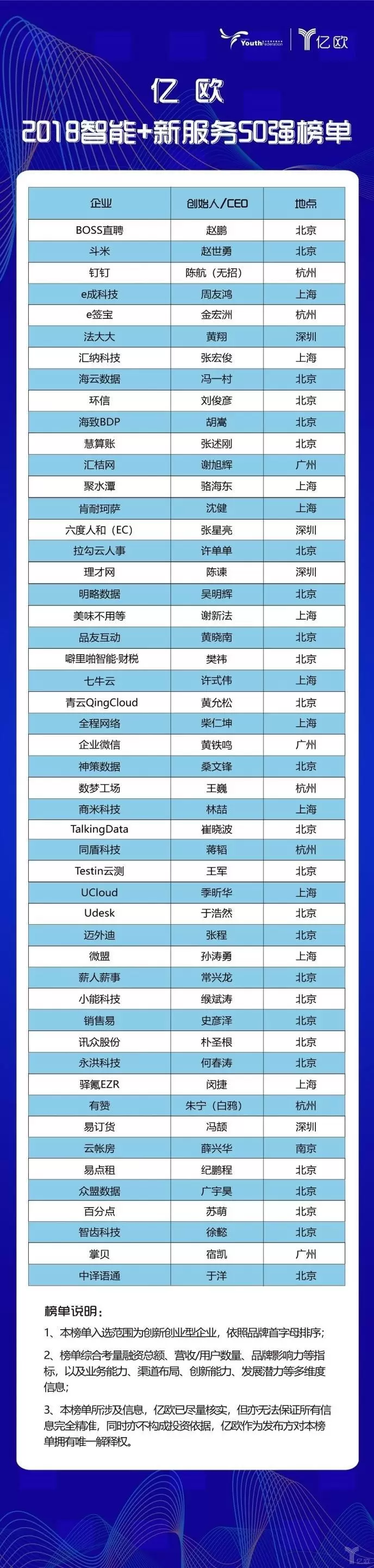 本次榜单的入选范围为创新创业型企业,排名依照品牌字母顺序;榜单综合考量融资总额、营收/用户数量、品牌影响力等指标,以及业务能力、渠道布局、创新能力、发展潜力等多维度信息,最终筛选出2018年最具综合实力的智能+新服务企业50强,引起行业的广泛关注。