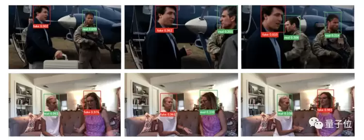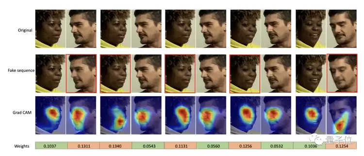 实验结果表明,假脸的权重比较高,说明该方法在仅需视频级别标签的情况下,可以很好地定位到假脸,具有一定的可解释性: