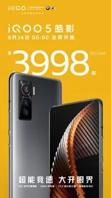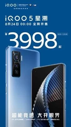 2020年8月24日0:00,全新5G“性能旗舰”iQOO 5正式开售,其中8GB+128GB版售价3998元、12GB+128GB版售价4298元、12GB+256GB版售价4598元,提供皓影与星溯两种配色,购买享24期免息、赠XE710耳机、半年碎屏宝和半年延保等多重优惠政策。
