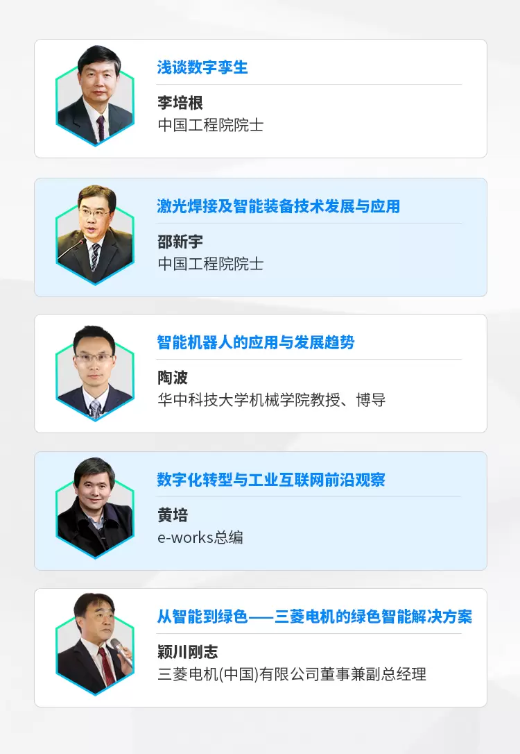本次论坛邀请到中国工程院李培根院士、邵新宇院士,三菱电机(中国)有限公司董事兼副总经理颖川刚志,华中科技大学机械学院教授、博导陶波,e-works总编黄培博士等权威专家分享智能制造领域的真知灼见;腾讯、施耐德电气、中车时代、烽火通信、东风机车、杭叉集团等知名企业将带来智能制造实践案例。