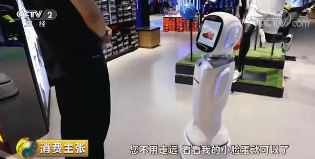 当记者说想逛逛无人店的时候,旺宝主动当起了导购。它跟记者保持着一致的步伐,不时地与记者进行攀谈,当听说记者想看耐克的足球鞋时,旺宝竟然说:"您不用走远,看看我的小脸蛋就可以啦。"随即旺宝的屏幕上就显示出多款相关产品供选择,等记者有进一步兴趣时,旺宝即将他带到了商品展示区,让用户现场试用。