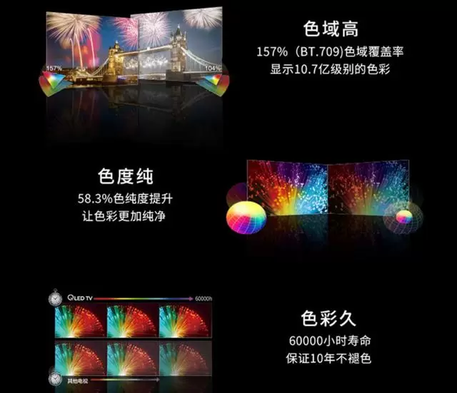 TCL是大屏电视的推动者,致力通过更大的屏幕为用户带来更沉浸的观看体验,并且在屏幕技术上,TCL也走在了行业的前列。以目前高端电视市场上主流的QLED量子点电视为例,TCL的QLED量子点Pro 2020技术拥有10.7亿级别的色彩显示能力,具备157%(BT.709)的高色域和58.3%的色纯度,能实现长达60000小时的持久色彩显示效果,保证10年不褪色。此外,TCL还与全球知名的ONKYO安桥音响共同研发,为用户带来了拥有"声"临其境的大屏电视声学体验。
