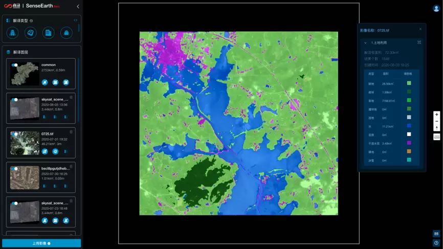 在全新升级的SenseEarth 平台,用户即可自主上传TIF等格式的遥感影像文件,并通过直观的滑动、圈选等操作方式选择需要解译的区域。在选定相应的解译功能后,就能获得精准的解译结果。