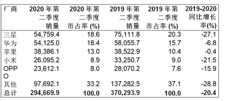 Gartner:二季度全球智能手机销量下滑20% 华为智能手机销量基本追平三星
