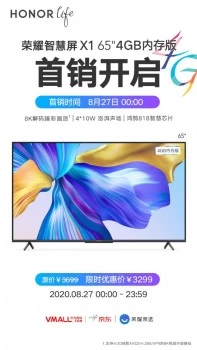 荣耀智慧屏X1 65英寸4GB内存版8月27日正式开启首销,同步登陆华为商城、京东和荣耀亲选。原价3699元,当天下单可享限时优惠,到手仅需3299元。