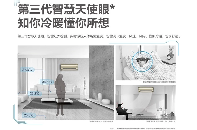 第二代美的风语者空调的“无风感+第三代智慧天使眼”,无风感技术由第一代舒适星空调的1906个微风圆孔,升级为7928个方向不一,大小各异的紊流柔风微孔矩阵,让强劲气流逐步柔化,实现无风感有凉感。第三代智慧天使眼,智能红外检测,实时感应人体所需温度,智能调节温度、风速、风向,知你冷暖懂你所想。