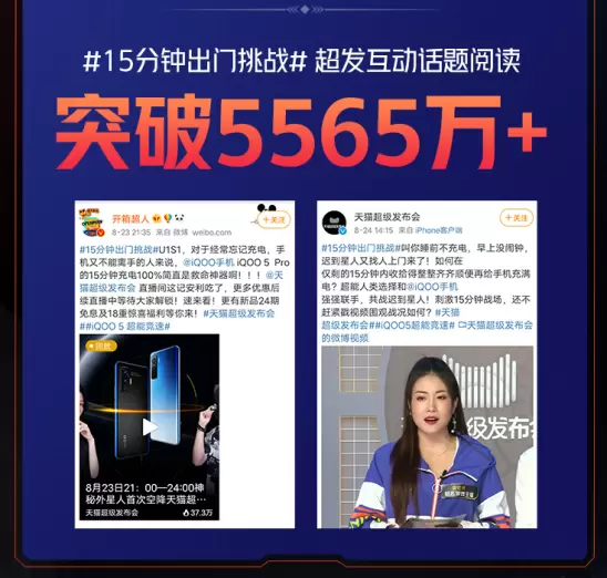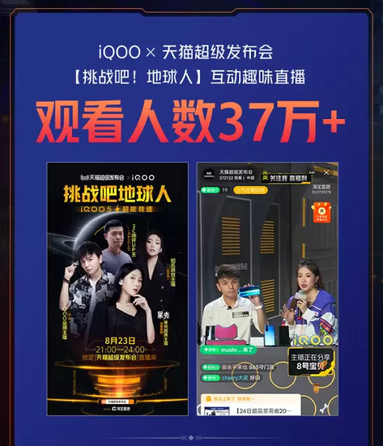作为iQOO品牌首次天猫超级品牌日,其推出了诸多极具创意的互动环节。比如说,8月23日,iQOO&天猫超级发布会互动直播,凭借iQOO 5超高的人气,播放量一度突破了37万+。