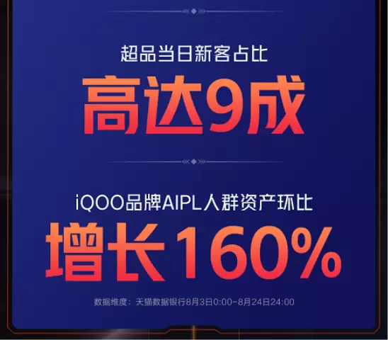 凭借以上极具创意的活动,iQOO在天猫超级品牌日期间,品牌AIPL消费者资产同比新品上市前,增长了160%,超品当日店铺新客占比更是达到了9成。