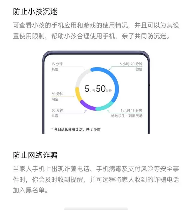 另外,「远程守护」还可以查看被守护者的用机时长,而且还可以对其用机的时长进行设置,这样就可以好好监督家里的小孩了,避免沉迷游戏了。值得一提的是,「远程守护」还能防诈骗,遇到安全事件,可以一键协助处理。可对病毒应用进行查杀、对诈骗电话设置拦截、设置支付保护、设置短信权限禁止乱扣费等,避免不必要财产丢失。