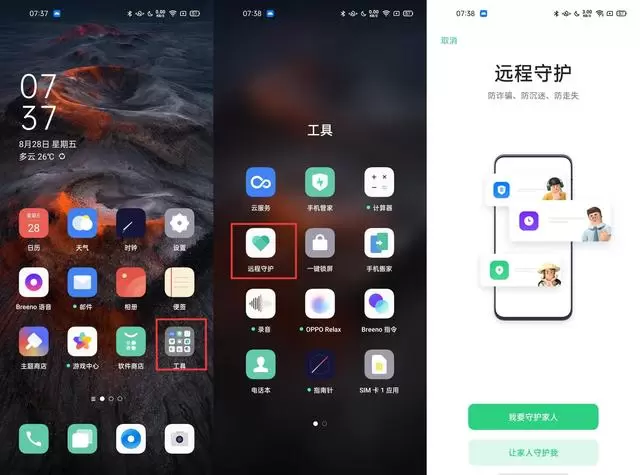 其实,在 ColorOS 6 系统上,OPPO 就率先推出了「远程守护」功能,后来系统更新则是完善其功能和使用体验。ColorOS 7.2 系统中的「远程守护」功能开启步骤也十分简单,在桌面找到「工具」,然后打开「远程守护」,点击「我要守护家人」,然后通过扫描二维码添加需要守护的家人信息即可。而对于需要被守护的一方,点击「让家人守护我」就会自动生成二维码信息。