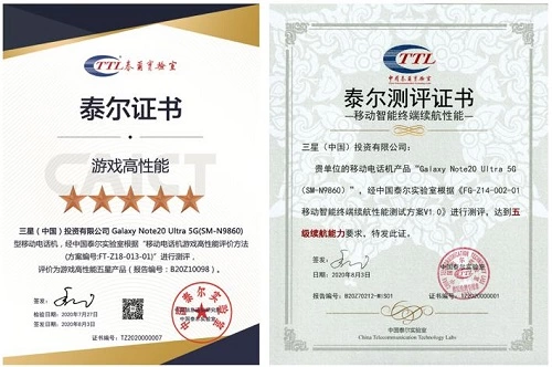 当屏幕推至极致后,在性能上,三星GalaxyNote20系列也一贯传承了极其“凶悍”的水准。首先高通骁龙865+处理器,搭配了LPDDR5与UFS3.1的存储组合,让其在运算处理方面,特别是在运行游戏大作方面有着出类拔萃的表现。要知道在目前的市场中,搭载骁龙865+处理器的手机产品除了三星Galaxy Note20系列外,只有个别专业的游戏手机,可谓少之又少,再加之其超高速5G网络,足以让用户尽享驰骋游戏世界的畅快。其次,三星Galaxy Note20系列此次配备了该系列有史以来最大容量的电池,并且能够智能分配功耗,更在配合超级加速充电技术的使用下,让用户无需过分担心电量。也正因此,在游戏体验上,三星Galaxy Note20 Ultra荣获了中国泰尔实验室为其颁发的游戏高性能五星认证以及移动智能终端续航性能五级续航能力证书。让用户无需执着于专业游戏手机,选择三星Galaxy Note20 Ultra也能享受专业级的“超神”游戏体验。