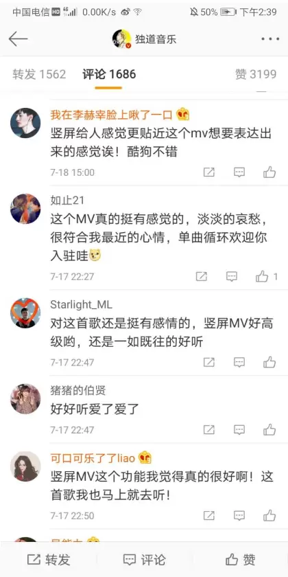 许多明星歌手、音乐人也是将自己的音乐视频MV做成竖屏模式,粉丝们不仅可以看到由他们出演的MV,而且更能切身感受到他们在MV中所传递的情感。竖屏MV功能刚上线就产生了超高热度,这也说明了竖屏模式极大的符合了用户的需求。