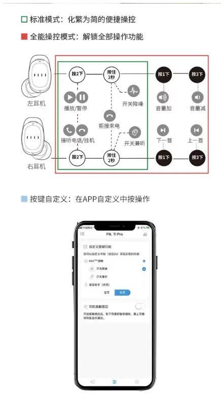 同时,FIIL T1 Pro采用电容式触控,双耳均可独立进行操作。盲点即可完成播放、暂停、接听等操作。并新增按键自定义功能,均可满足用户的独特需求。