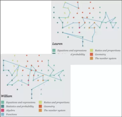 ALEKS最独特的特点是或许就是它构建了一个精确的知识图谱,确切地在一个非常精细的知识点级别表明学生到底掌握了什么。学生知识映射的关键是每门课程的知识图谱。 知识图谱是连接主题的有向图。 一个典型的ALEKS课程可能由500个这样的知识点组成,对于这些知识点中的任何一个,系统随时都会对学生做出(通常是准确的)预测,以了解该知识点是已经被掌握、已经准备好可以开始学习、尚未掌握,还是还没有准备好开始学习。这种精确的,高分辨率的学生知识映射,(1)使系统能够提供一个非常强大的自适应学习环境,学生在这里不会浪费时间处理那些太容易(已经掌握)或太困难的知识点( 还没有准备好学习),以及(2)很多教育工作者非常看重每个学生在课程中知识的精确诊断。