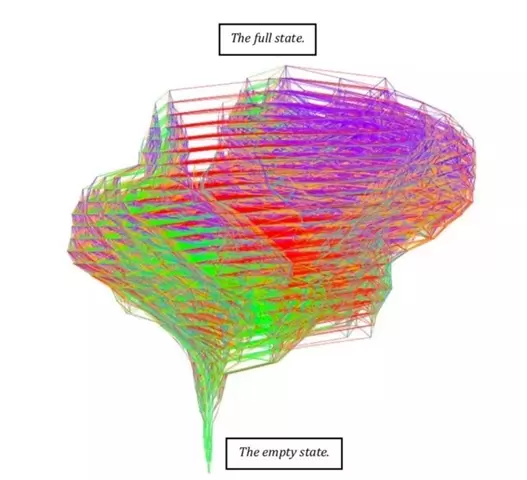 一个知识图谱代表一个学科主题的知识体系,不同的学生对知识掌握程度不同,对应的知识状态也不一样。一个知识点数量较少的简单知识图谱可以较快穷尽所有可能的知识状态,如图ALEKS-1所示为含有五个知识点的图谱穷尽出来的所有可能的知识状态。但是含有数百个知识点的复杂知识图谱是很难以穷尽所有可能的知识状态,图ALEKS-2很形象的形容了含有45个知识点的图谱穷尽知识状态的复杂性。图中不同颜色代表不同的知识点,图中每一个点代表一个知识状态。