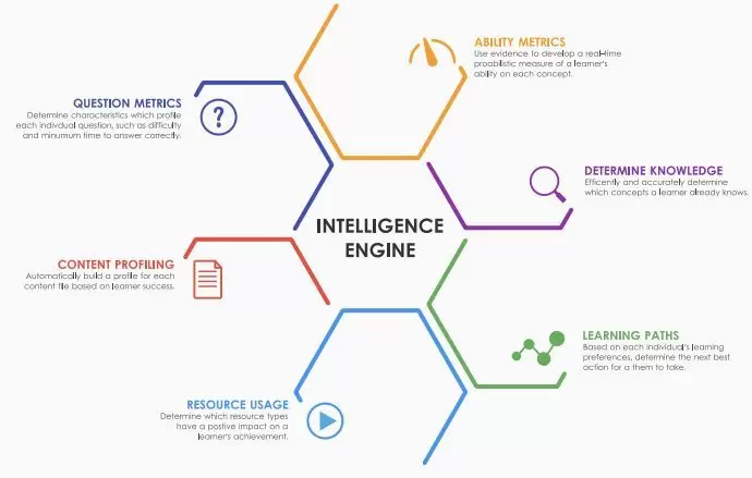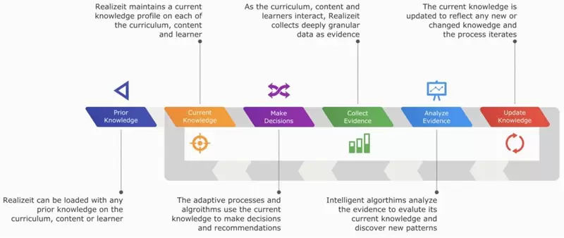 - Realizeit以自适应智能引擎为基础模拟教师一对一教学过程。Realizeit首次实现了学习者个人技能的判断方法,在学生学习的每一个步骤中,根据学生的学习成果和模式为其提供最佳课程指导,实现了为每一位学习者选择最佳学习路径,保证最有效的学习。最后以自适应学习引擎为基础观察并适应每个学生的可变技能、行为和学习偏好,利用自身的精确性和高性能确保每个学生能够接受最全面的个性化学习体验,从本质上模仿一对一的教师-学生学习情境。