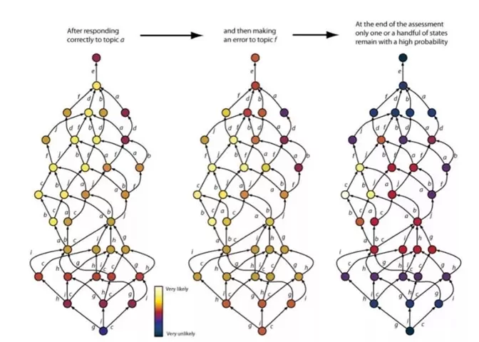 ALEKS AI的优势在于仅采用20至30个问题就能有效地确定学生对300至500个知识点的掌握情况。 需要指出的是,知识图谱中的知识点前后置关系越多,评估就越有效率。 因此,在过去的5到10年中,该模型得到了扩展和改进,以包含其他更复杂的链接,这些链接进一步减少了知识状态,几乎不牺牲评估准确性。 我们不会在这里讨论这个更复杂的系统,但会注意到这些链接涉及与先决条件相关的“或”关系:意思是知识点Z可以具有X或Y两个先行知识点,这意味着XZ,YZ ,以及XYZ都是包括Z的有效状态,但是Z单独不是有效状态,因为掌握Z之前学生必须掌握X或Y。图ALEKS-3描述了评测过程中,ALEKS-AI系统对学生知识状态的更新和调整。