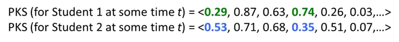 比如说有两个学生,两个学生的PKS在下面状态。学生1的PKS状态在回答问题1的正确概率是0.29,回答问题4的正确概率是0.74;学生2在某一个时间回答第一个问题的正确概率是PKS=0.53,到回答第四个问题时PKS是0.35。