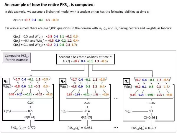我们的假设是学生的能力和题目需要的能力,可以用知识轨道的系数来表达,能力有可能是10个知识轨,也有可能是20个知识轨。举例说我们用5个知识轨,根据模型,可以了解在任何时候学生回答问题有三个因素决定了PKS,一个是学生在各知识轨道的能力,二个是问题的权重,第三个是问题的中心概率值,我们采用PKS的CDF函数来了解一个学生回答一个问题概率准确度,用一个等式来决定概率准确率。