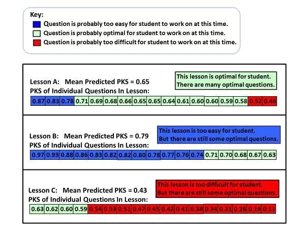在这里,可以看到蓝色代表是太容易的,绿色代表最优化的,红色代表太难的。通过这种方法就可以了解到,对于A学生来说这个时间点内他的内容应该怎么样去选择。通过蓝色、红色的图表显示现在的情况,这一堂课的分布情况。比如说在这里A、B、C三门课,它的平均值是0.68、0.67、0.63,这一堂课有些问题是难的,比如说这里有0.52、0.46,有些问题对于这些学生太容易了,比如说0.87。可以看到,C课程总体太难了,PKS平均值是0.43,大部分问题对于这个学生来说是没有办法回答的。不仅在题目和内容的选择上,在学习路径的搭配和智适应推荐的原理上,这个模型也能够直接和我们现有的模型对接和共同使用。