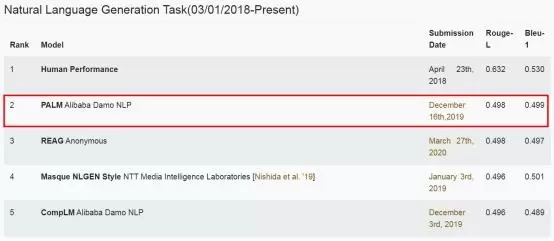 【达摩院自研生成式预训练模型PALM在MS MARCO NLG榜单中位居第一(仅次于人类水平)】