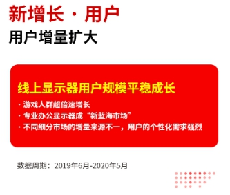 数据显示,过去12个月以来,线上显示器用户规模平稳成长,而这样增长趋势也正源于居家消费需求的拉动以及供应链变革等因素的影响。疫情期间,由于宅家游戏、办公的强需求,电竞显示器迎来超倍速增长,专业办公显示器也成市场宠儿,带动了显示器用户增长呈现提速的大趋势。