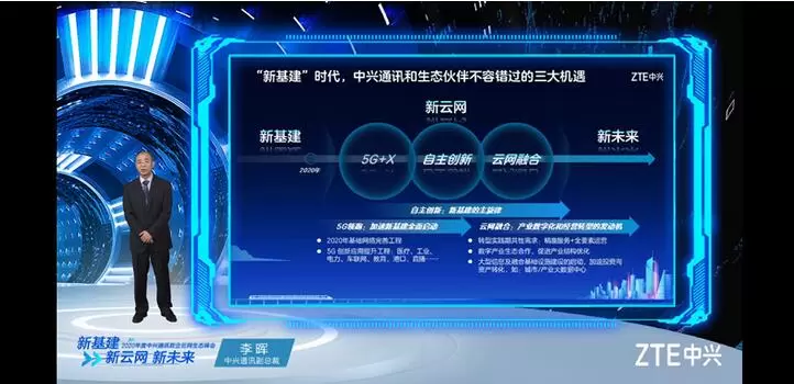中兴通讯副总裁李晖在《新基建、新云网、新未来》的主题演讲中全面诠释了在新基建时代,5G+X、自主创新、云网融合,是中兴通讯必须把握住的三大机遇。他将2020年云网生态升级的要点总结为“1+X+3”——“1”是指云网基石、“X”是指各类能力中台、“3”是指云网生态的3大保障体系,并表示此架构将助力中兴通讯与合作伙伴在新基建的主航道上领跑先行,开拓新未来。