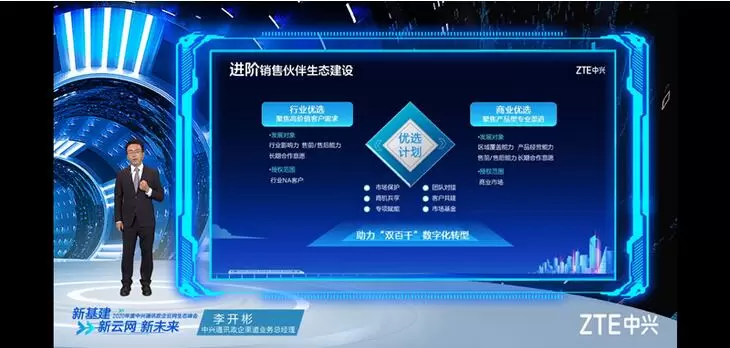 中兴通讯政企渠道业务总经理李开彬推出“合作伙伴优选”试点计划,宣布将从市场保护、专项赋能等方面加强支撑力度,助力“双百千”数字化转型。他表示,中兴通讯愿与业内更多优秀的合作伙伴共同成长,打造更强、更优的云网生态圈。