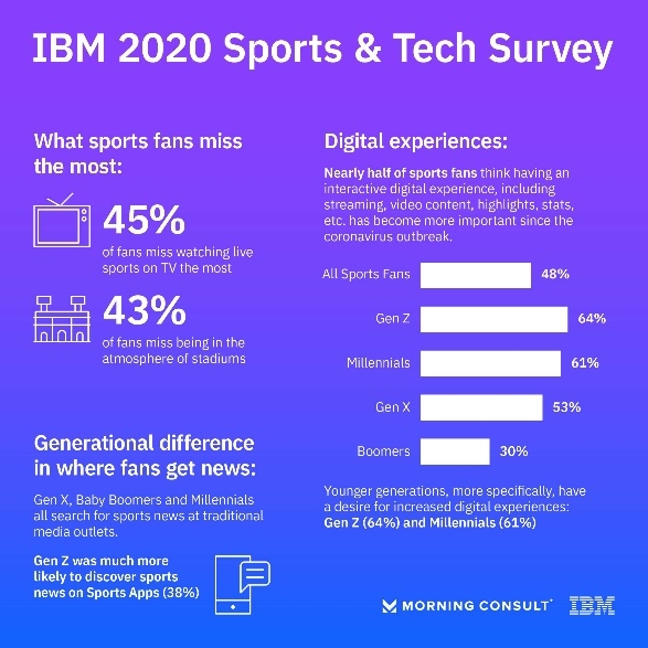 由IBM 资助的一项针对美国2000 名体育爱好者的近期调查显示出新冠疫情期间数字化体验的重要性。近一半 (48%) 的受访者认为,疫情爆发后,拥有互动式的数字体验(例如, 包括流媒体、视频内容、集锦、统计等等)变得更为重要1。其中,年轻一代对数字化体验尤其渴望,Z 世代(Gen Z,出生于1995年后) (占比64%)和千禧一代 (占比61%) 均表示,数字化体验已变得“更加重要”。