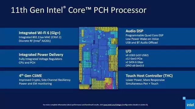 第11代智能处理器采用了英特尔Gaussian和神经加速器 2.0(英特尔 GNA)增强的音频功能,实现背景噪音抑制并降低CPU工作负载、AI增强型背景模糊和视频分辨率增强。该系列处理器还集成Thunderbolt 4功能,支持多达 4 个端口,可连接广泛外设,支持通过单线缆快速充电、连接外部显示器和扩展存储。Tiger Lake还支持12b HDR 8K显示屏,并同时支持多达4个HDR 4K显示屏。同时将系统级功耗改善近20%,使用电池播放视频的时间延长1个小时以上。