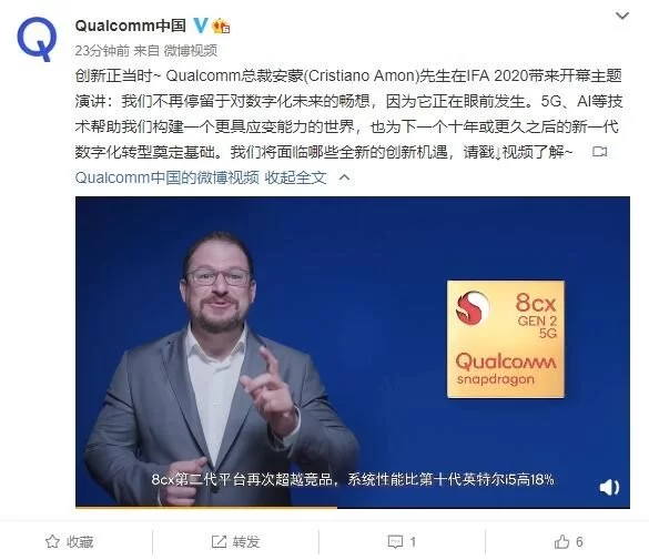目前展会已经亮相不少最新科技成果,比如高通在IFA上宣布推出骁龙8cx第二代5G计算平台。 据介绍,骁龙8cx第二代 5G计算平台的系统级性能和电池续航均优于竞品解决方案50%以上,骁龙计算平台还助力PC实现多天电池续航。而且骁龙8cx第二代5G计算平台是高通推出的第二款同时支持毫米波和6GHz以下频段5G连接的计算平台,支持Wi-Fi 6。