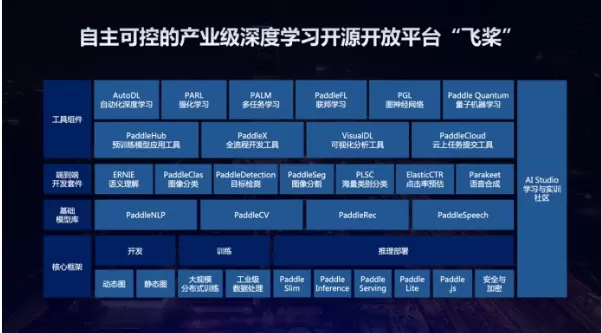 而在芯片之上,深度学习框架上承应用,下接芯片,可以说是“智能时代的操作系统”。百度研制的中国首个开源开放、功能完备、完全自主可控的产业级深度学习平台飞桨,拥有开发便捷的深度学习框架,支持千亿特征、万亿参数的超大规模深度学习模型训练技术,多端多平台部署的推理引擎和产业级开源模型库等四大领先技术。