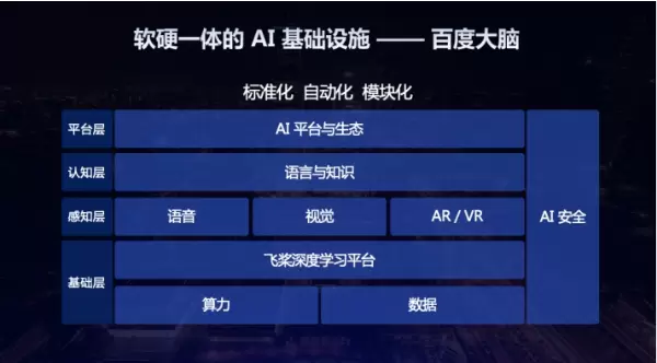 百度作为国内投入最早、技术最强、布局最完整的人工智能领军企业,既是AI基础设施的建设者,也是AI技术及应用创新的引领者和推动者,百度大脑即是百度打造的软硬一体的AI基础设施。其基础层包括算力、数据技术,以及以飞桨深度学习平台为核心的算法平台,感知层包括语音、视觉、AR/VR等技术,认知层是语言与知识技术。同时,还拥有纵贯各层完整的安全体系,以及面向开发者和合作伙伴的AI平台与生态。