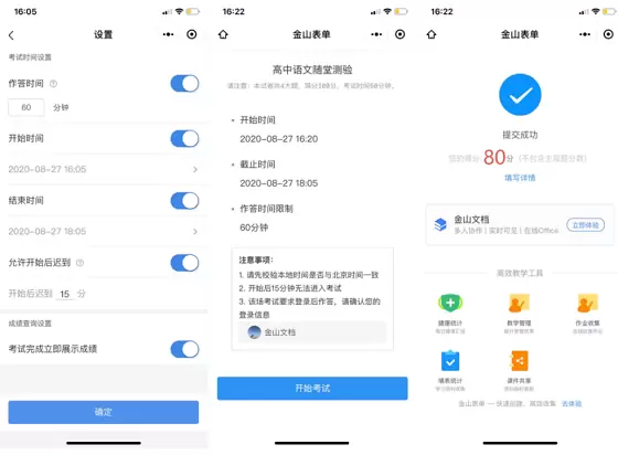 用金山表单,师生即使在线上也能完成完整的考试流程。教师可以在金山表单内的「在线考试」功能中设置线上考试的作答时间,考生若超时,将自动提交。还可以规定开始时间和结束时间,允许迟到,模拟真实的考场环境,使线上考试也有紧张感。此外,考生答题完毕后,可以自助查看成绩。