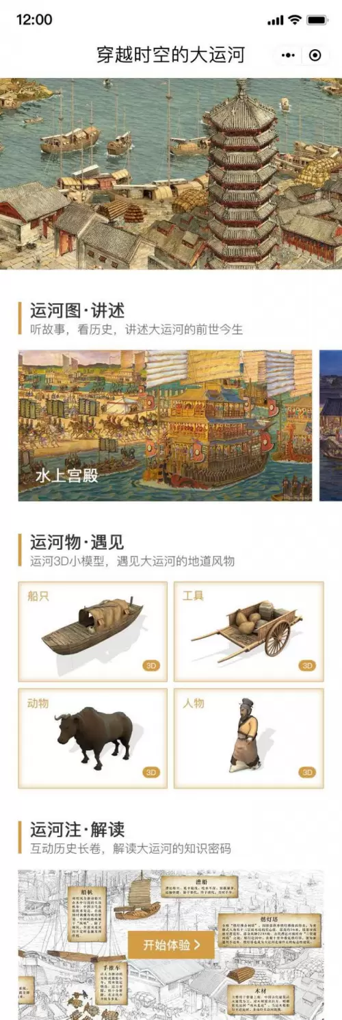 该小程序主要由运河图、运河物、运河注三部分构成,通过剧场解说、3D模型演示、历史长卷互动等形式,展现大运河文化的前世今生。