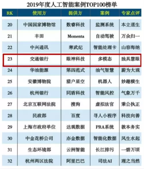 近年来,交通银行一直致力于智慧银行产品与服务的创新与推广,积极探索人工智能与银行业务的应用触点,以客户体验为核心,打造安全便捷、时尚个性的金融服务体验。早在2010年,交通银行就已引入眼神科技的指纹、人脸识别系统推出了及时发卡机、智能桌面、一对多等服务项目,双方早已建立了稳定、友好的合作关系;2018年,眼神科技为交通银行搭建了ABIS 多模态生物识别统一身份认证平台,融合指纹、人脸、指静脉、虹膜等多种核心技术,可实现多模态的自动决策体系、多维度可配置化的人员身份特征识别体系,全面应用于VIP识别、无人银行、智易通、手机银行等应用场景和业务范围;2019年,眼神科技凭借为交通银行打造的“总行生物识别平台项目”,入选中国科学院主管核心杂志《互联网周刊》发布的“2019人工智能案例TOP100”榜单,双方合作成果获得权威认可。