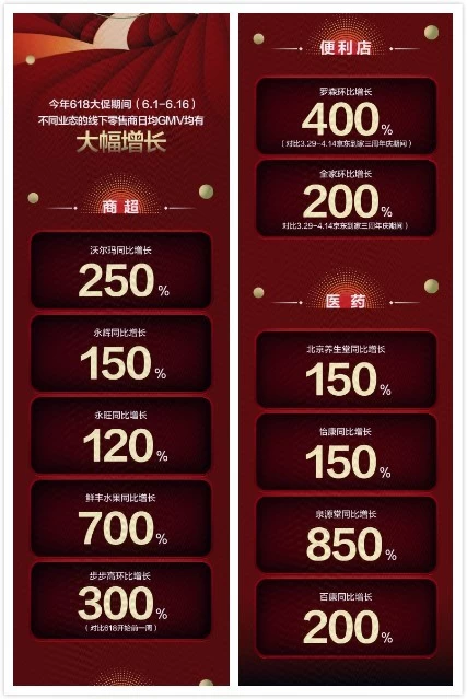 通过京东的赋能,线下零售也迎来了全面爆发。以和京东到家合作的便利店为例,6月1日—16日与京东到家415三周年庆期间(3月29日-4月14日)相比,罗森销售额同比增长400%。医药行业方面,北京养生堂和怡康同比增长150%;百康同比增长200%;泉源堂更是同比增长850%。